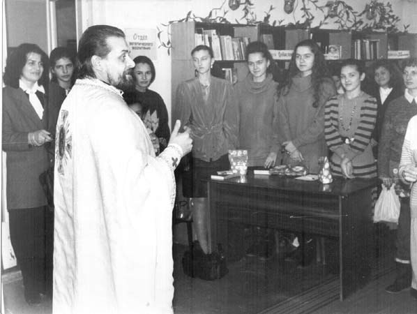 о. Анатолій Мазурик промовляє перед просвітянами. 90-і роки